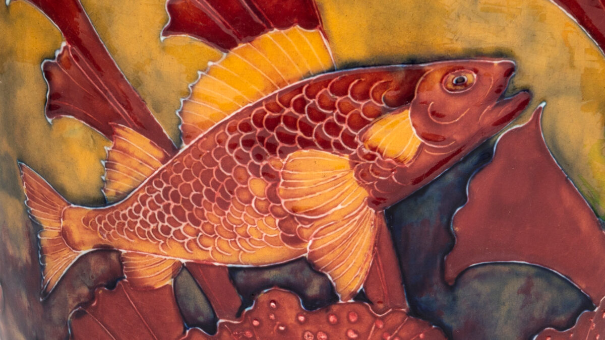 MOORCROFT “Flambe Carp” rare English pottery urn vase finely decorated with six carp amongst waterweed, highlighted in flambe glaze,